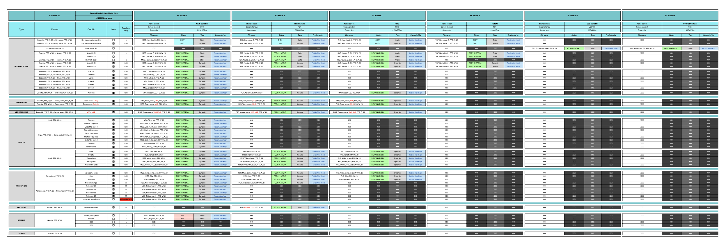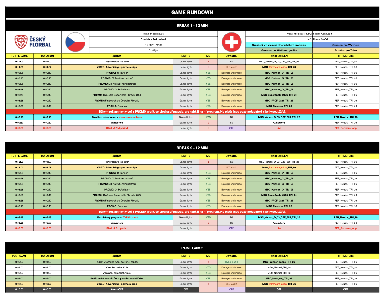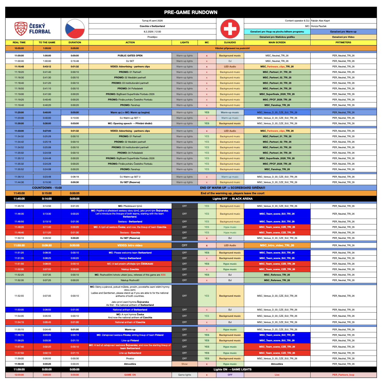Každá vteřina eventu je naplánována v tzv. scénáři. Ten zahrnuje vše od otevření bran arény pro veřejnost až po slavnostní medailový ceremoniál. Mezi nejoblíbenější prvky patří interaktivní aktivity pro fanoušky, jako: populární Kiss cam (zábavní prvek na sportovních zápasech a koncertech, kdy kamera náhodně vybírá dvojice v publiku a jejich obraz promítá na velkoplošnou obrazovku s očekáváním, že se políbí) nebo soutěžní kvíz během přestávky.