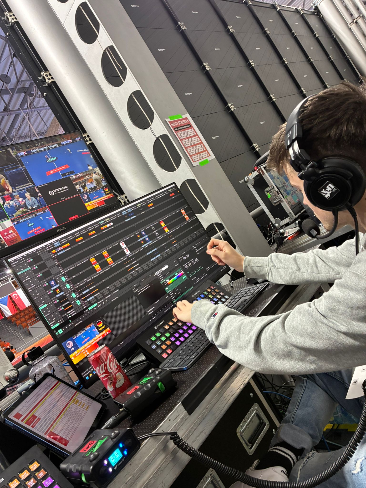 Pokud si myslíte, že atmosféra v zaplněné hale vzniká jen tak náhodou, nahlédněte do „srdce“ stadionu – do režie. Je to v podstatě řídící centrum celé show, kde sedí parta lidí, co nesmí mrknout. Celému tomu chaosu vládne režisér, který koordinuje celý produkční tým a ručí za to, že vše proběhne bez jediného zaškobrtnutí. My, jako operátoři contentu a editoři, jsme pak ti, kdo do diváků chrlí intro videa, gólové animace nebo bleskové statistiky přímo během hry. Aby to mělo tu správnou energii, doplňují nás osvětlovač s dýdžejem, kteří gradují vizuální a hudební smršť přesně v těch momentech, kdy jde o všechno. A zatímco my se potíme u monitorů, v terénu tuhle energii přenášejí na lidi maskoti, moderátor a nepřehlédnutelná hype crew. Jsou to „profesionální povzbuzovači“, kteří fungují jako most mezi sportovním týmem a publikem. Jejich úkolem je rozhýbat tribuny, zapojit každého fanouška a vyždímat z publika maximum emocí, aby se aréna otřásala v základech.