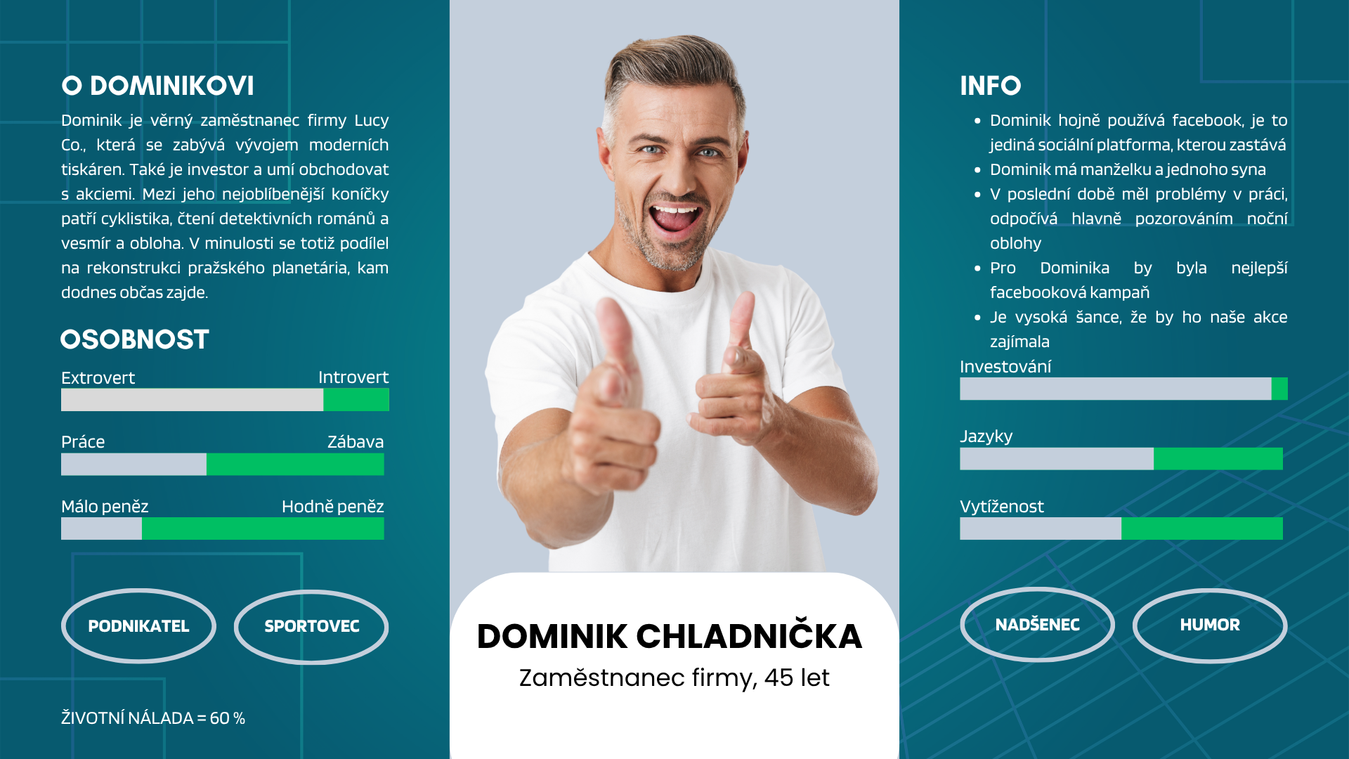 Čeho chce tvá persona nejvíce v životě dosáhnout? Jaký má životní cíl? Řeší teď nějaké pracovní nebo rodinné problémy? Má nějaké tajné přání? I lidská vnitřní touha a zloba dokáže ovlivnit chování na trhu.